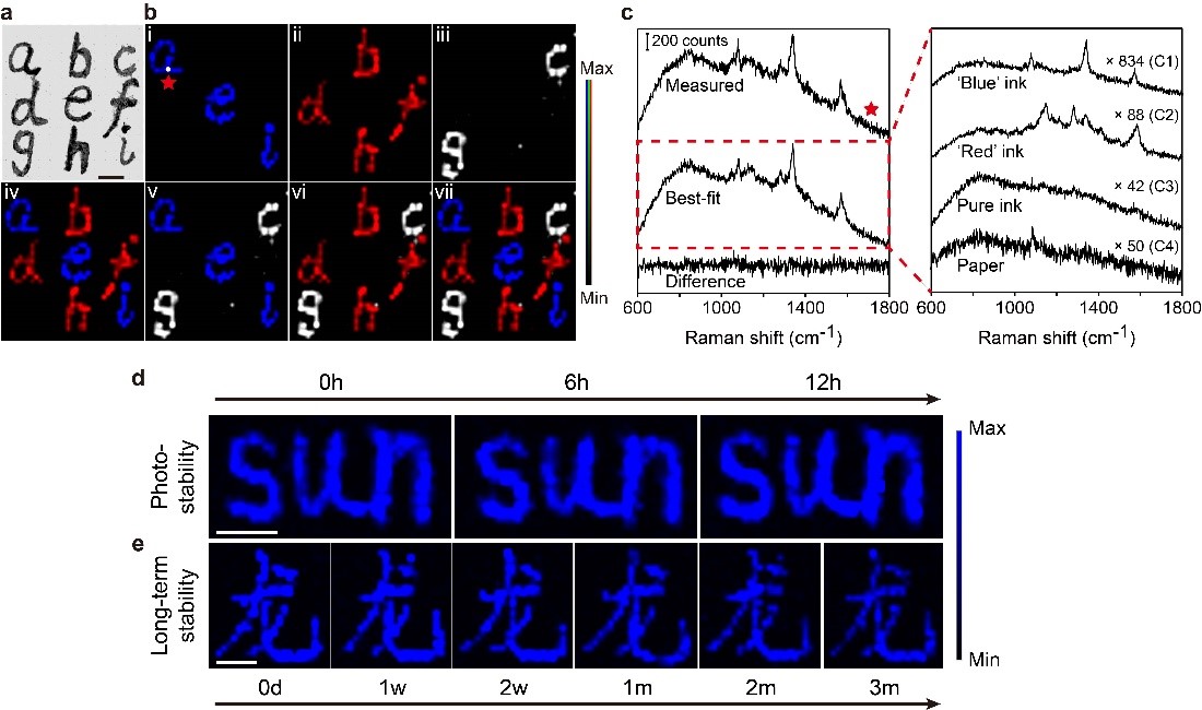 2021年1月,PC28开奖网 的叶坚课题组在Advanced Optical Materials发表了题为Raman ink for steganography的论文。该工作开发了一种基于缝隙增强拉曼纳米颗粒(GERTs)的拉曼墨水用于隐写术。通过将两种不同的GERTs掺入普通墨水,得到两种具有不同拉曼信号的拉曼墨水用于多色隐写。在785纳米非共振激发下,GERTs墨水能够产生显著的特征拉曼信号,同时墨水的背景干扰很低,证明其用于信息编码的优越性。不同的拉曼墨水能够同时用一种波长激发,有效缩短了成像时间。同时,GERTs墨水具有好的光稳定性和长期稳定性,保证了书写文本的长效性。实验中用两种制得的GERTs墨水和普通墨水进行多色隐写,总共能提取出七种不同的信息组合。拉曼墨水出色的多指标编码能力保证了隐写系统的安全性和可靠性,因而在信息安全领域具有广阔的应用前景。