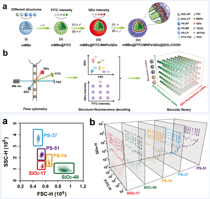为解决本领域的上述重要问题,该团队在国际上首次发现了通过改变介孔微球的孔隙率和基质成分等微球内部的精密结构,可在流式细胞仪上产生特殊的散射光信息,每类微球独特且有规律的散射光信息具有分群特征,从而提出了微球结构可作为一种全新维度的光学编码元素的假设。在此基础上,研究者创新性地提出了“结构-荧光”联合编码策略,即通过发展可对无机和有机微球均具有普适性的聚合物介导的染料掺杂法(该方法近期发表在Chem. Commun., 2021, DOI: 10.1039/d0cc08202c)在介孔微球的孔道内装载荧光染料分子,再在微球的外表面利用层层自组装法依次装载磁性纳米颗粒和荧光量子点纳米晶,成功建立了集三种编码元素(结构和双色荧光)、以及超顺磁特性的超高通量悬浮芯片系统。再利用流式细胞仪作为解码系统,成功实现了单色激光在单个反应管中一次激发与鉴别出300重编码微球,这是目前已有报道的最高记录,取得了本领域的突破。同时,利用该悬浮芯片系统还进一步实现了单管10重肿瘤标志物的联合检测,展现了多重指标联合检测的实际应用潜力。相关研究成果发表于《Small》(2021, 17, 2100315.),论文的第一作者为青年教师王耀助理研究员,通讯作者为徐宏研究员。此工作还得到了PC28开奖网 叶坚教授、邬崇朝长聘教轨副教授等团队的大力支持。该研究得到了国家自然科学基金(重大仪器专项、面上项目、青年项目)、上海市自然科学基金、上海市高峰高原学科建设、上海交通大学医工交叉等基金项目的资助。