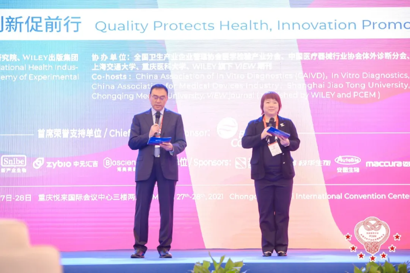 王华梁教授,宋海波教授为支持单位:贝克曼库尔特商贸(中国)有限公司、广州万孚生物技术股份有限公司、深圳市新产业生物医学工程股份有限公司、博奥赛斯(天津)生物科技有限公司、深圳迈瑞生物医疗电子股份有限公司、北京九强生物技术股份有限公司、罗氏诊断产品(上海)有限公司、重庆中元汇吉生物技术有限公司、深圳市亚辉龙生物科技股份有限公司、中翰盛泰生物技术股份有限公司颁奖。