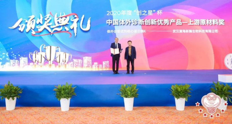 府伟灵教授为2020年度“创之星”杯中国体外诊断优秀创新产品金奖-上游原材料获奖单位:武汉瀚海新酶生物科技有限公司颁奖。