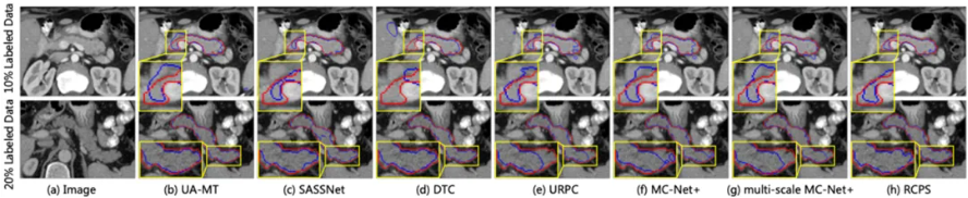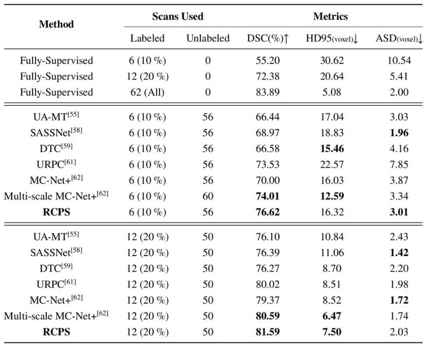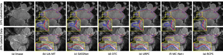 综上所述,RCPS算法在半监督医学图像分割中取得了良好的性能,通过多项验证证明了其有效性,该算法在医学图像的分割任务中表现出了明显的潜力,通过半监督分割的方式减轻了医生的标注负担,有助于加速临床阅片流程。