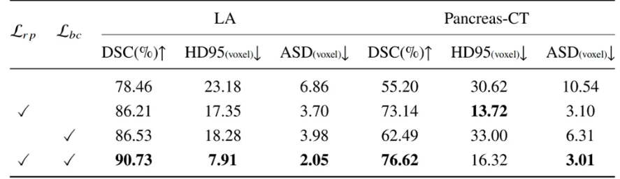 此外,在表3中,本研究对不确定性校正与双向体素对比学习的有效性进行了消融实验的分析。可以看到两项改进都能够对分割的效果带来显著的正面作用,且在二者结合时能够取得最优的分割效果,这也证明了RCPS算法的整体有效性。