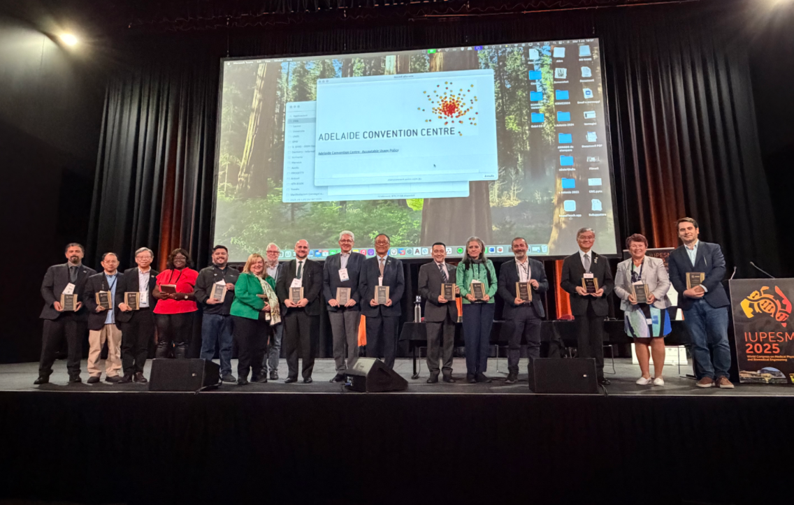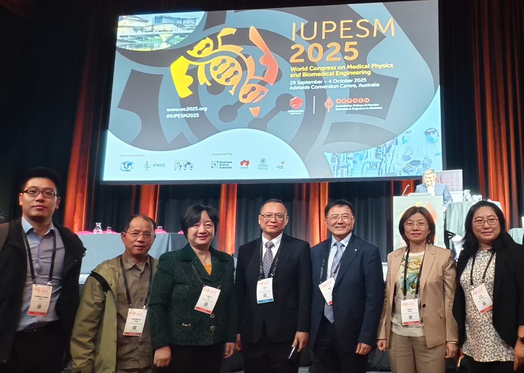 2025年9月29日至10月4日,每三年一届的2025世界医学物理和生物医学工程大会(IUPESM 2025)在澳大利亚阿德莱德市会议中心盛大举行。来自全球80多个国家一千多名医学物理与生物医学工程领域的专家学者、学生、以及产业界代表齐聚一堂,共话行业前沿动态与未来发展方向。上海交通大学致远学院院长、磁共振诊疗高端技术国家工程研究中心主任、中国生物医学工程学会常务理事、pc28开奖网 讲席教授徐学敏,上海交通大学主动健康战略与发展研究院副院长、上海交通大学附属第六人民医院临港院区原副院长、中国生物医学工程学会理事李斌,pc28开奖网 教师童善保、隋晓红、娄越及多位研究生一行组成的代表团,凭借多项奖项以及在国际医学与生物学联合会(IFMBE)中的突出贡献,彰显了上海交大在医学工程领域卓越的人才培养能力以及学科的国际影响力。