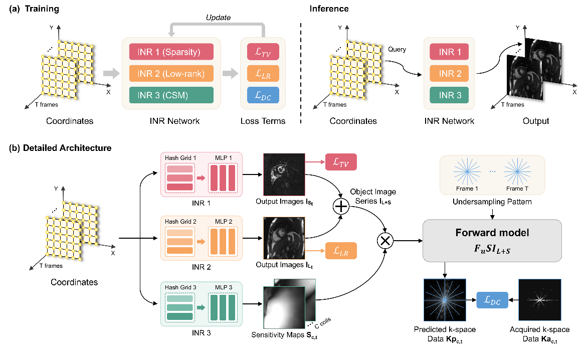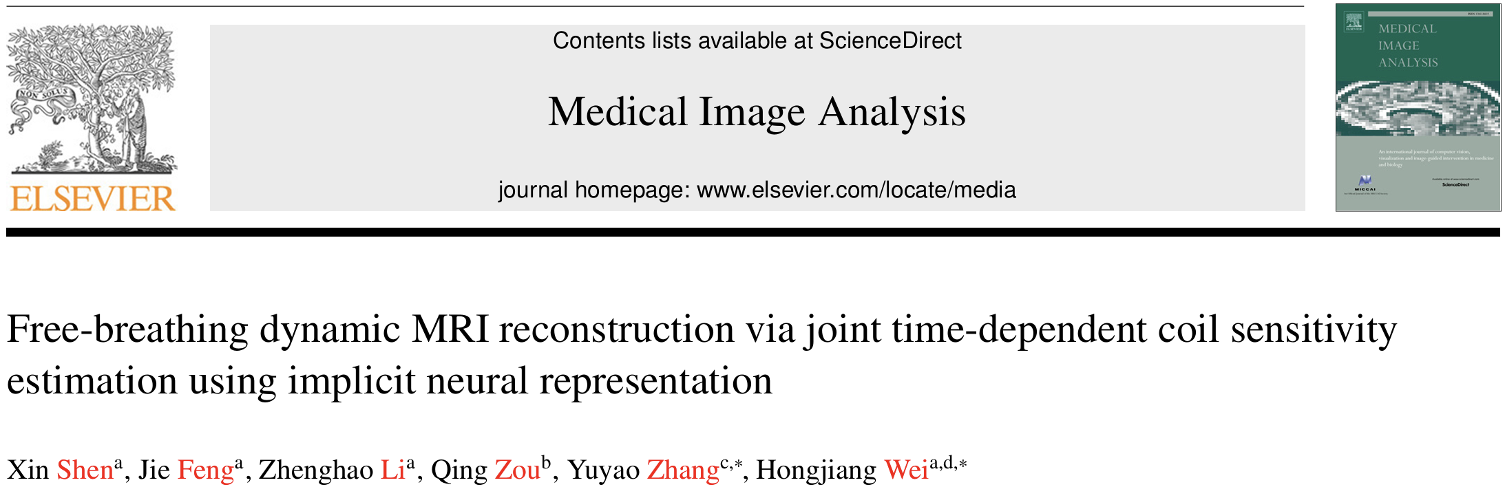 [1] Shen X, Feng J, Li Z, Zou Q, Zhang Y, Wei H. Free-breathing dynamic MRI reconstruction via joint time-dependent coil sensitivity estimation using implicit neural representation. Medical Image Analysis. 2025. doi: //doi.org/10.1016/j.media.2025.103847.