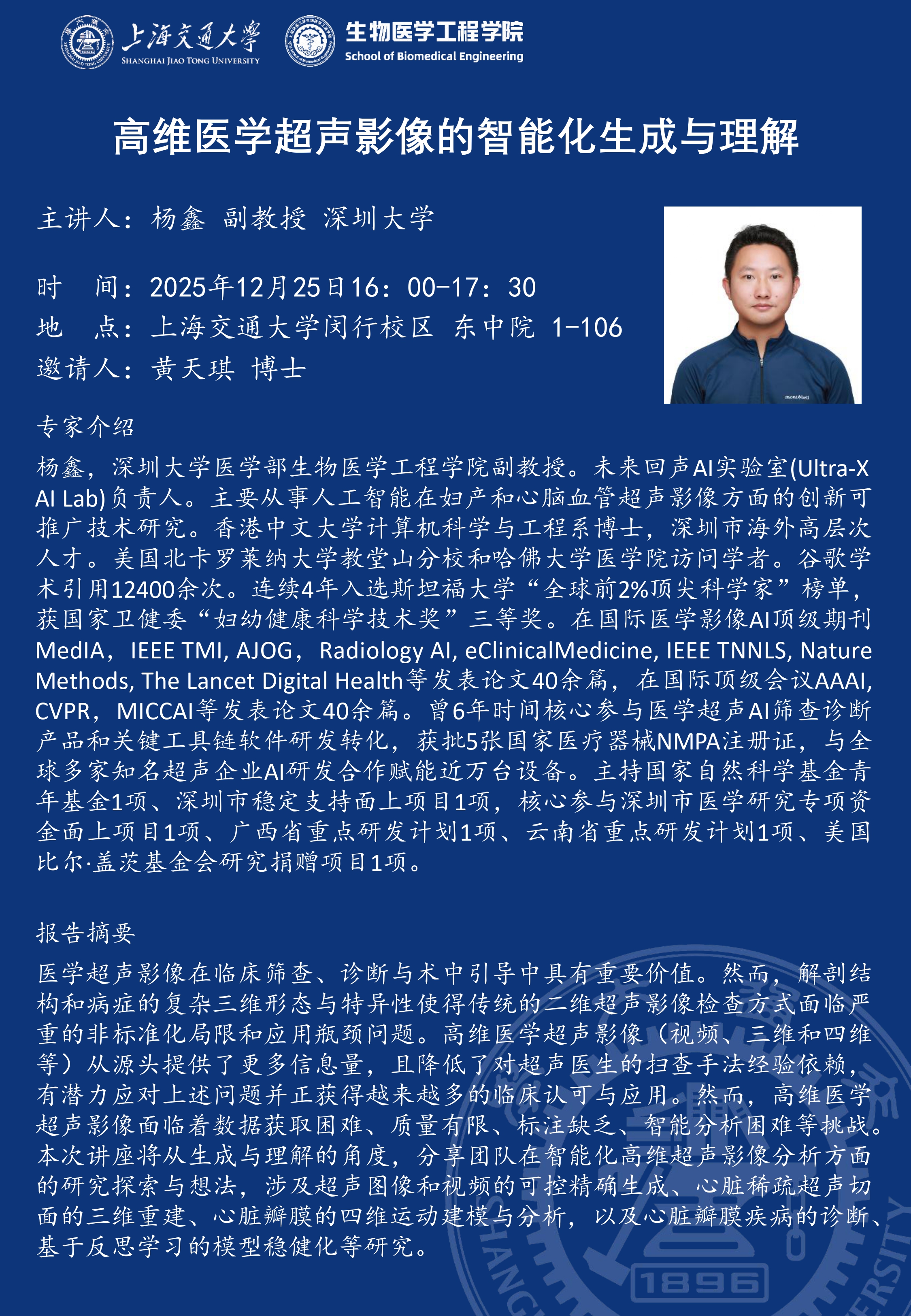 医学超声影像在临床筛查、诊断与术中引导中具有重要价值。然而,解剖结构和病症的复杂三维形态与特异性使得传统的二维超声影像检查方式面临严重的非标准化局限和应用瓶颈问题。高维医学超声影像(视频、三维和四维等)从源头提供了更多信息量,且降低了对超声医生的扫查手法经验依赖,有潜力应对上述问题并正获得越来越多的临床认可与应用。然而,高维医学超声影像面临着数据获取困难、质量有限、标注缺乏、智能分析困难等挑战。本次讲座将从生成与理解的角度,分享团队在智能化高维超声影像分析方面的研究探索与想法,涉及超声图像和视频的可控精确生成、心脏稀疏超声切面的三维重建、心脏瓣膜的四维运动建模与分析,以及心脏瓣膜疾病的诊断、基于反思学习的模型稳健化等研究。
